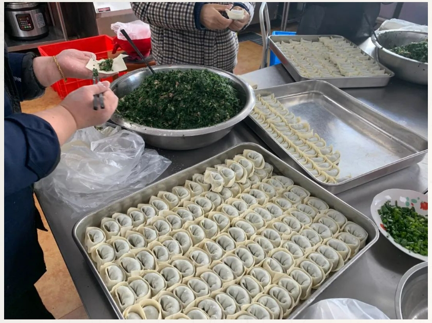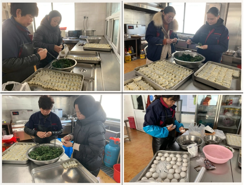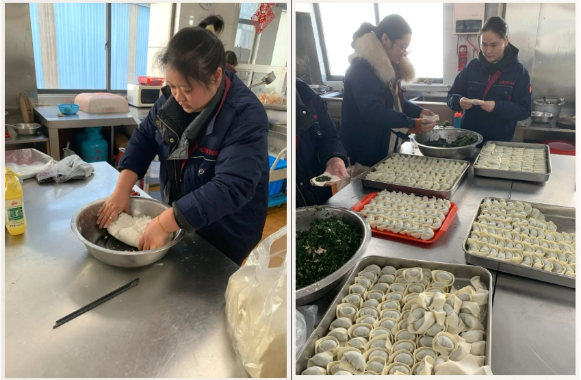 大家分工協(xié)作,和面、調餡、包餛飩,整個(gè)過(guò)程井然有序有條不紊,整個(gè)食堂洋溢著(zhù)節日的喜慶氛圍。